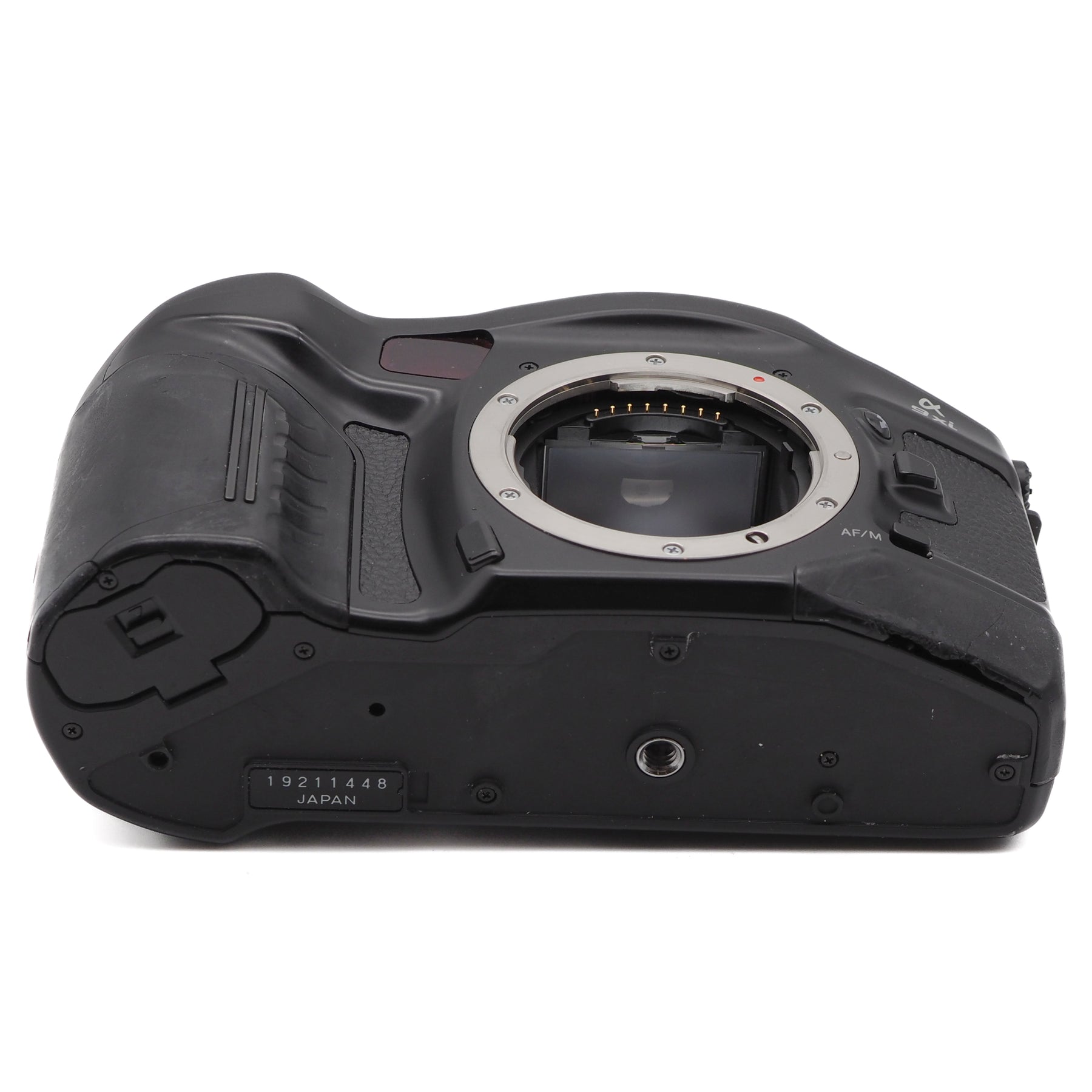 This camera appears cosmetically fair with some scuffs or scratches, with some cracks on the rubber grip and cover. The rubber cover on the bottom plate has been removed.